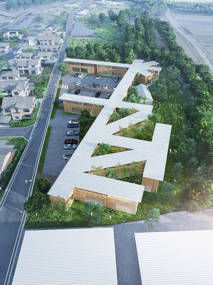 一般集合住宅コストをターゲットに汎用性の高いCLT造ユニットモデルを構築し、ユニットの集合・離散によって、内外多様な濃度変化に富む住環境と集まりの場を創造する。ユニット間の距離が同じ場で生活を営む人々に共有する風景を生み、井戸端のような場が編み込まれ、同じ時間を共有する。地方の豊かな自然に溶け込む、この住宅群が自分と近い世代の人々が集まる、一つの集落のような風景をつくりだす。
