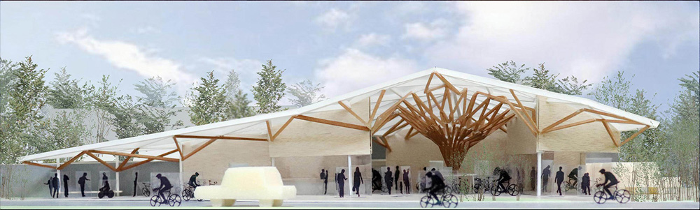 自転車ロータリーを中心に大きな傘の下で様々な場が生まれ、人々と環境が一つにつながる建築を目指した。