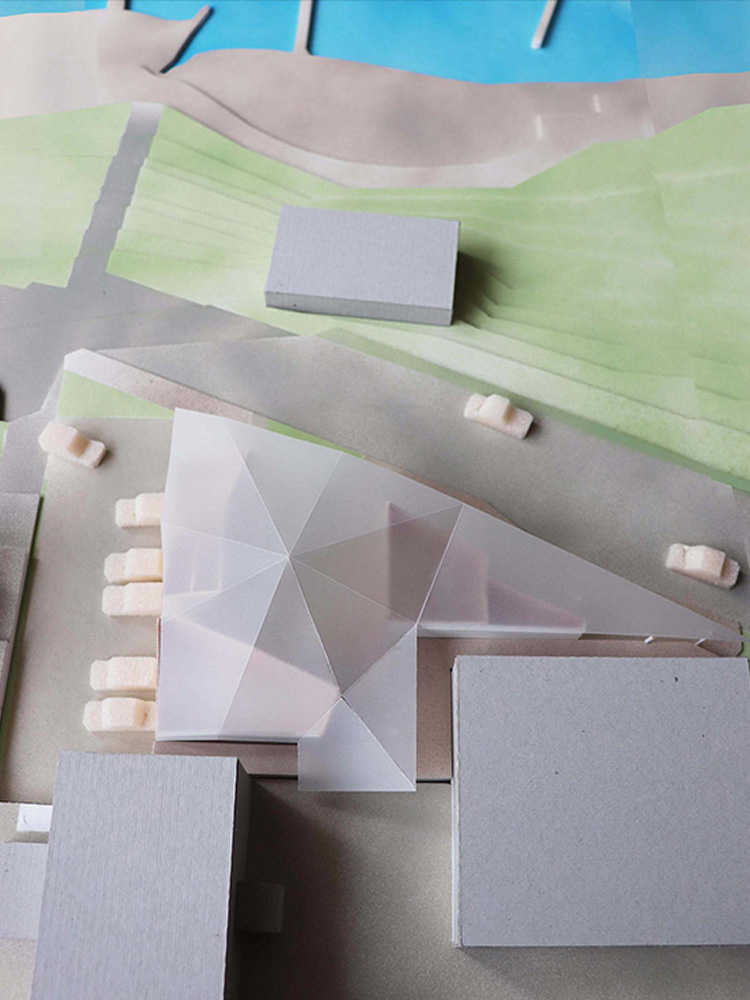 2020年オリンピックの自転車競技コースとなった山中湖の、自転車の為の駅を計画した。山中湖・自転車ルートに向かって大きく傘を広げたように立ち、周囲の環境と一体になる建築を目指した。分散する小さな施設をRC造で群島のように点在させ、中央に鉄骨柱を立て、傘を広げるように木組を展開させ、幕屋根を広げた。